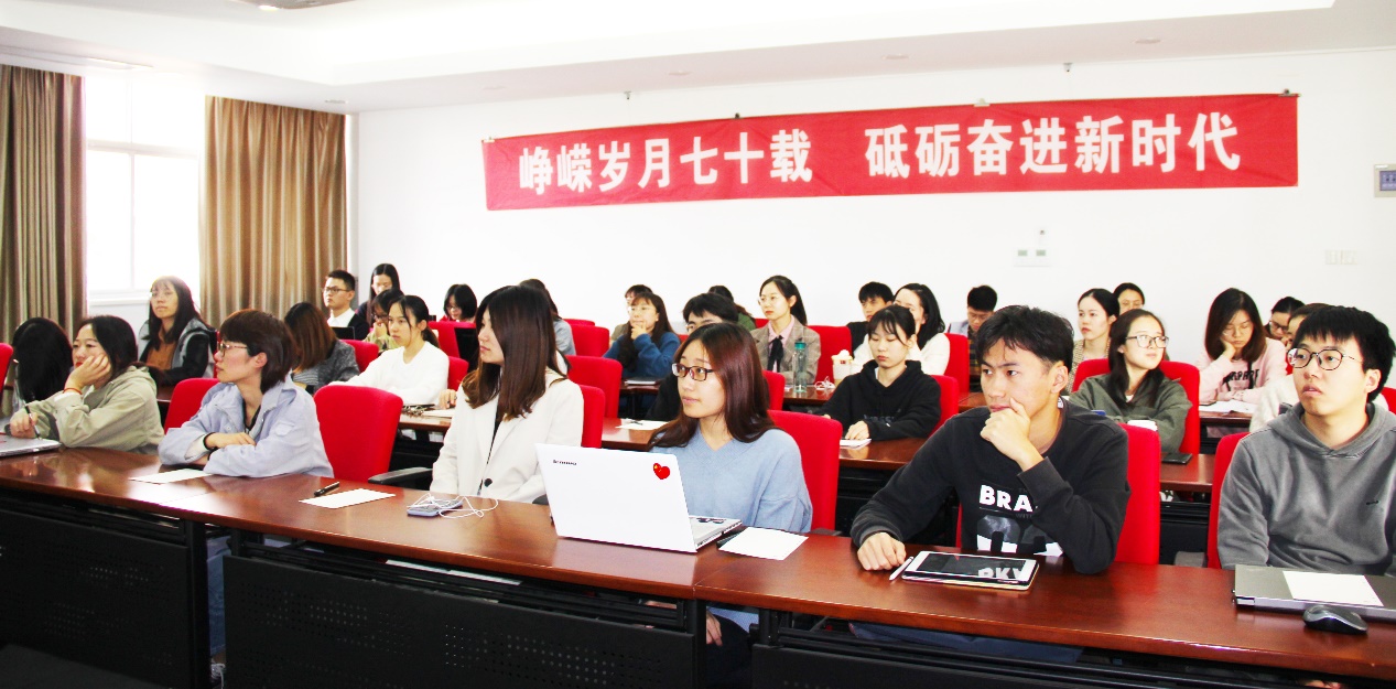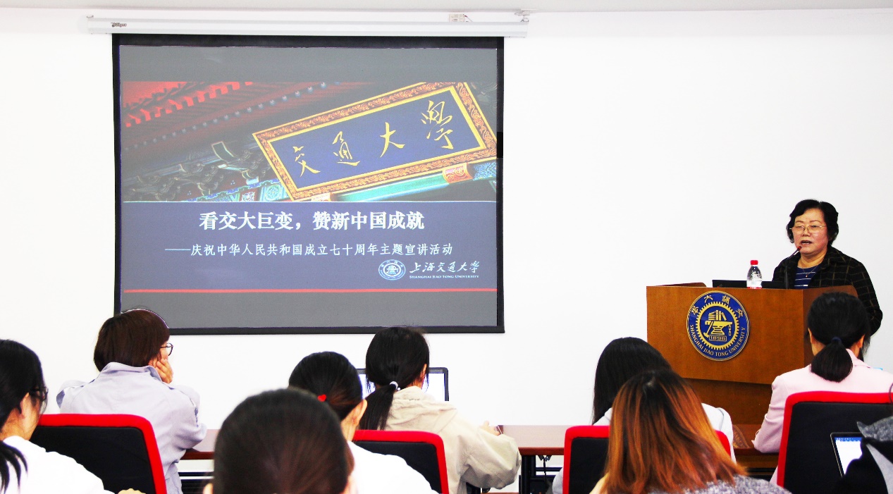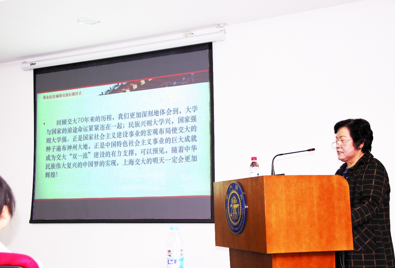 吴玉瑛老师首先别开生面地向大家讲述了交大七十载历史变迁,从交大培养目标、办学模式的转变到学校办学规模的全面提升三个方面,系统概括了七十年以来交大的卓越进程,回顾了学校最初在艰难困苦的条件下办学,发展至现今国内一流大学的不易。正如吴老师所说,“70年来,交大走过了一段不平凡的道路,取得了巨大的成就。”